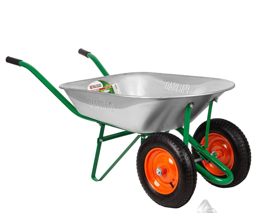 Двухколесная садовая тачка для перевозки тяжелых грузов. Два пневматических колеса повышают устойчивость, а оцинкованный кузов объемом 78 л подходит для грунта, мусора и строительных материалов.