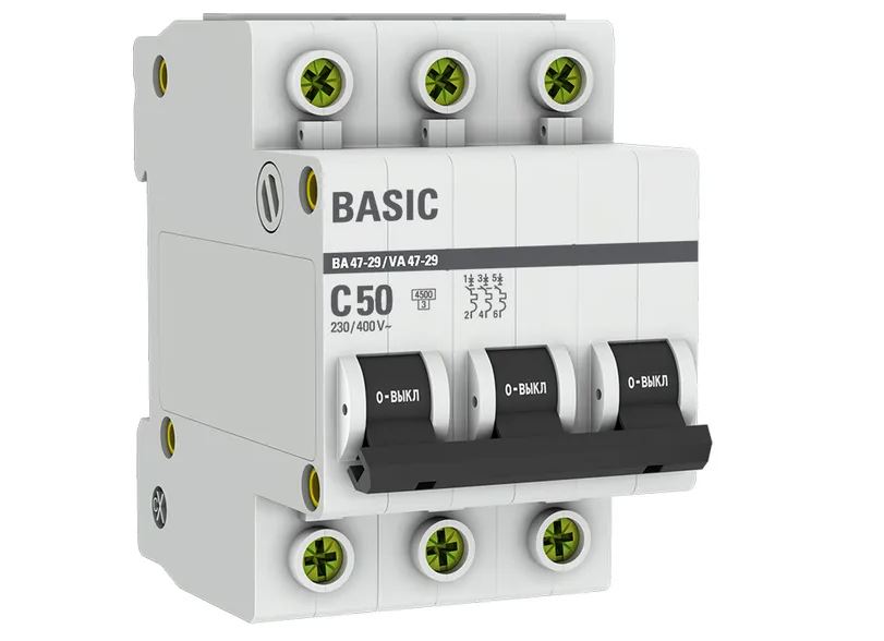 Автоматический выключатель 3P 50А (C) 4,5кА ВА47-29 EKF Basic предназначен для защиты электрических сетей от перегрузок и коротких замыканий. Он оснащён электромагнитной и электротепловой защитой, что обеспечивает быстрый отклик при аварийных токах.