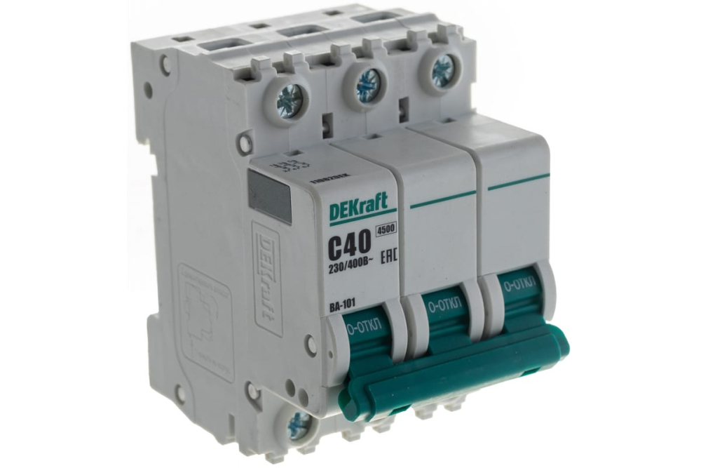 Автоматический выключатель ВА-101-3P-040A-C DEKraft 11082DEK предназначен для защиты электрических цепей от перегрузок и короткого замыкания. Он подходит для установки в электрические щитки жилых, общественных и промышленных зданий благодаря высокой отключающей способности в 4,5 кА.