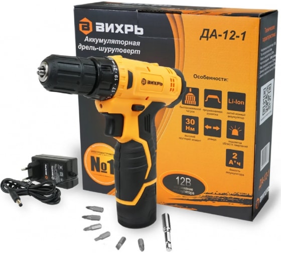 Аккумуляторная дрель-шуруповерт Вихрь ДА-12-1 - мощный инструмент с напряжением 12 В, предназначенный для сверления и закручивания шурупов. Он обеспечивает максимальный крутящий момент 24 Нм и частоту вращения до 550 об/мин, что делает его идеальным для различных задач по крепежу.