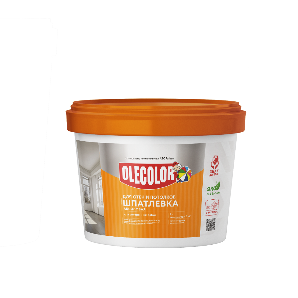 Шпатлевка акриловая OLECOLOR для стен и потолков, 0,9 кг предназначена для финишного выравнивания бетонных, оштукатуренных и других минеральных поверхностей внутри помещений. Представляет собой белую пастообразную массу со слабым запахом. После высыхания образует прочную и гладкую матовую поверхность, устойчивую к сухим истираниям. Не требует дополнительного грунтования перед покраской или оклейкой обоями. Обладает хорошей шлифуемостью, небольшой усадкой и удобна в нанесении. Время высыхания — около 24 часов, рекомендуемая толщина слоя — до 2 мм за один проход. Применяется на стенах и потолках в жилых и общественных помещениях.