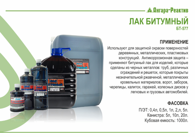 Лак битумный ПЭТФ 9 кг (БТ-577) — антикоррозионное покрытие на основе нефтяного битума, предназначенное для защиты металлических конструкций и изделий при хранении и транспортировке. Используется в строительстве, машиностроении, энергетике и других отраслях. Образует прочную защитную пленку, устойчивую к влаге, механическим воздействиям и атмосферным осадкам. Также применяется для изготовления алюминиевой краски.