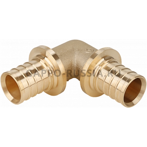 Латунный угольник 90° для поворота трассы при монтаже труб PE-X/PE-RT. Соединение выполняется по аксиальной (надвижной) технологии.