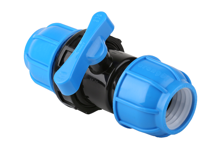Шаровой запорный кран для перекрывания потока воды в системах водоснабжения и полива. Рассчитан на монтаж с трубами ПНД соответствующего диаметра без применения сварочного оборудования.