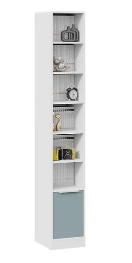 Высокий стеллаж Марли в бело–серо-голубой гамме предназначен для хранения книг, учебников, коробок и декоративных объектов, формируя вертикальную систему хранения в детской или кабинете.