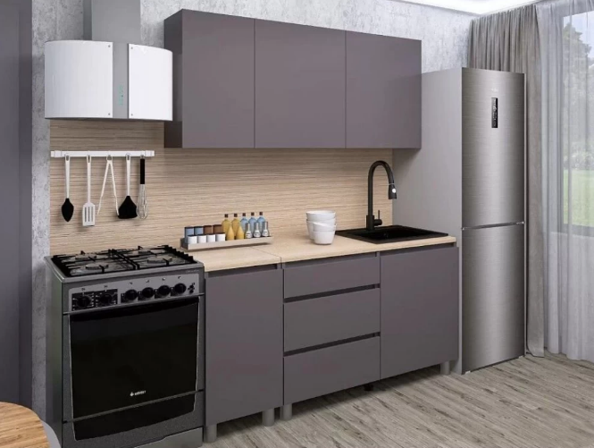Кухонный гарнитур представляет собой готовый комплект шкафов для обустройства компактной кухни. Сочетание графитовых фасадов и декора Дуб Сонома подходит для современного интерьера.