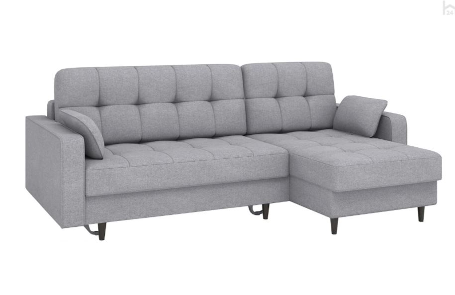 Это угловой диван-кровать с декоративной стёжкой, высокими ножками под дерево и сдержанным современным силуэтом. Модель подходит для ежедневного использования и помогает организовать просторную зону отдыха.