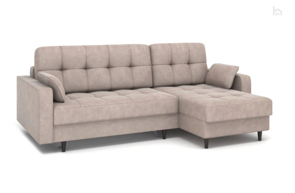 Это угловой диван-кровать с декоративной стёжкой, высокими ножками под дерево и сдержанным современным силуэтом. Модель подходит для ежедневного использования и помогает организовать просторную зону отдыха.