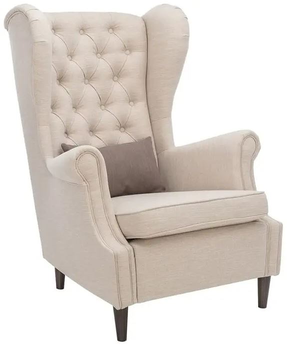 Это каминное кресло для отдыха с высокой спинкой и мягкой тканевой обивкой. Модель сочетает классический силуэт, удобный наклон спинки и натуральные материалы каркаса.