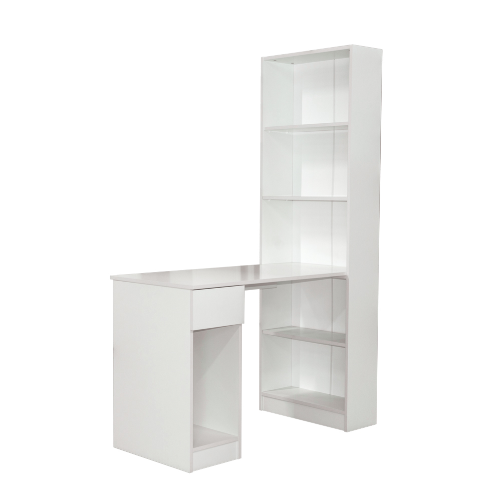 Это комбинированный шкаф-стеллаж с письменным столом для организации компактной рабочей зоны. Модель объединяет открытую систему хранения, выдвижной ящик и нишу под системный блок, помогая рационально использовать пространство комнаты.