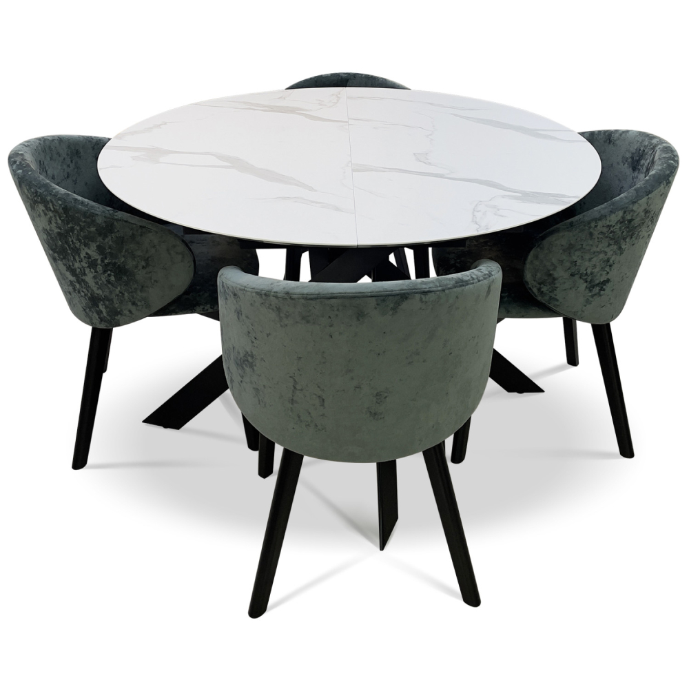 Это круглый раздвижной обеденный стол в современном стиле для кухни, столовой зоны или гостиной. Модель сочетает столешницу на основе МДФ с термостойким HPL-пластиком и металлическое основание, поэтому подходит для ежедневного бытового использования.