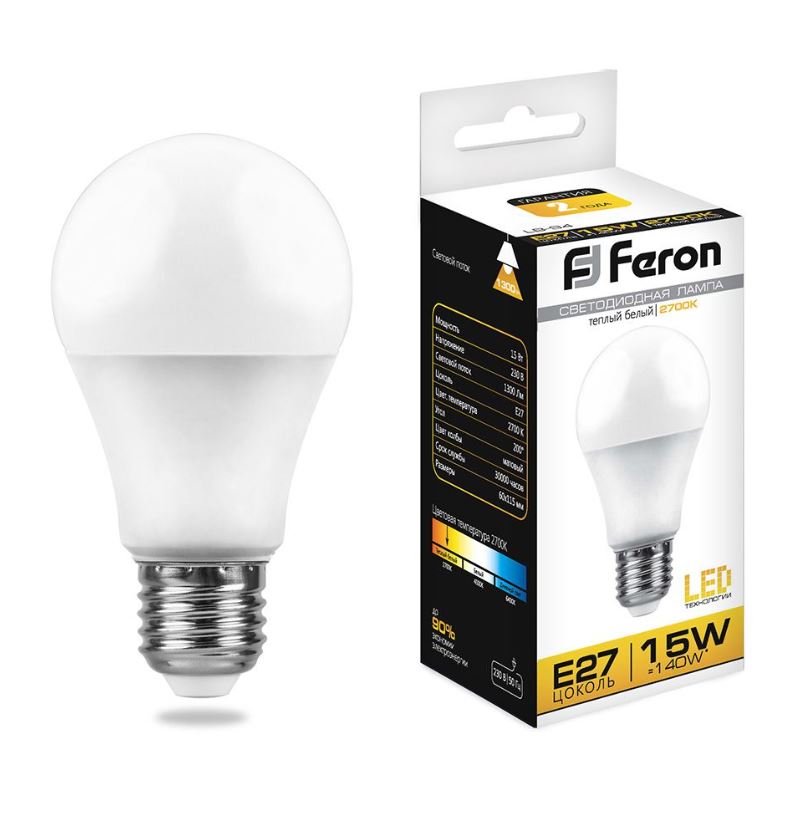 Светодиодная лампа Feron с цоколем E27 и матовой колбой для общего освещения. Матовый рассеиватель делает свет мягче и уменьшает слепящий эффект.