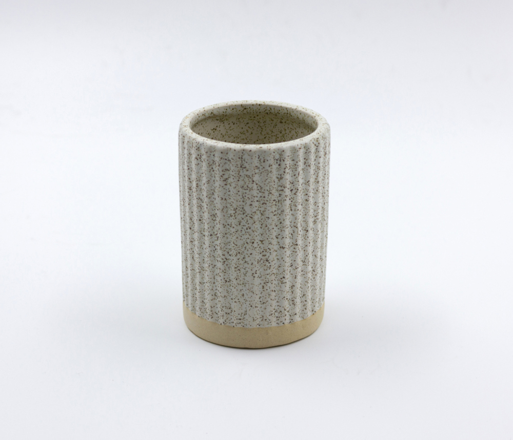 Керамический стакан с покрытием 'песочная глазурь' предназначен для использования в ванной комнате и отличается рифлёной текстурой. Изделие выполнено в благородном песочном цвете, что способствует его гармоничному вписанию в интерьер.