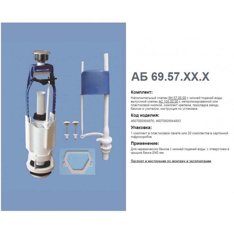 Арматура для сливного бачка унитаза с нижней подводкой А 105.57.27.3 представляет собой комплект, который включает кнопочный механизм для смыва и необходимые элементы для установки. Основное предназначение – обеспечение надежного и эффективного наполнения и смыва в туалетных бачках.
