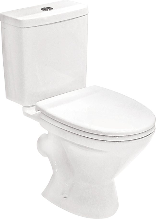 Унитаз-компакт Лига с косым выпуском и двухрежимным сливом. Практичное решение для типового санузла с комплектным сиденьем.
