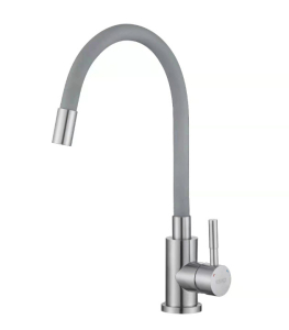 Однорычажный кухонный смеситель с гибким изливом серого цвета. Конструкция удобна для точного направления струи при ополаскивании посуды и мойки.