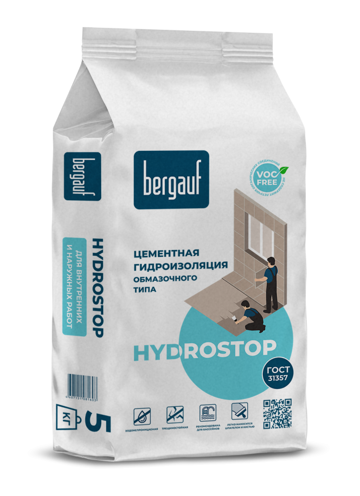 Bergauf Hydrostop – это цементная обмазочная гидроизоляция для надежной защиты стен, полов и потолков от влаги. Используется в ванных комнатах, санузлах, бассейнах, подвалах и других помещениях с повышенной влажностью. Образует прочное, эластичное водонепроницаемое покрытие, устойчивое к трещинам и постоянному контакту с водой. Наносится кистью или шпателем, подходит для внутренних и наружных работ.