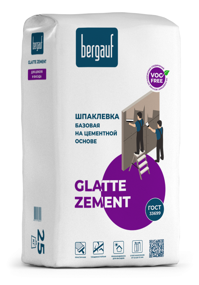 Шпаклевка базовая фасадная Bergauf Glatte Zement 25 кг предназначена для выравнивания и подготовки наружных поверхностей под декоративные покрытия, такие как штукатурка, краска или плитка. Применяется для работы с различными основаниями, включая бетон, кирпич, цементные и гипсовые поверхности. Обеспечивает прочную и долговечную основу для дальнейших отделочных материалов.