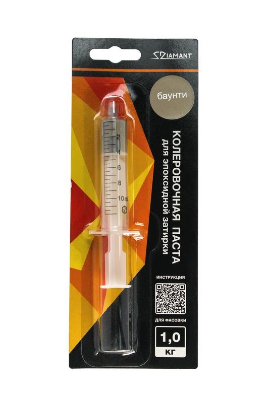 Колеровочная паста 027 Диамант- Баунти1 кг предназначена для ручной колеровки эпоксидной затирки Diamant. Она позволяет точно и эффективно изменять цвет затирки, обеспечивая идеальное сочетание с дизайном помещений. Паста поставляется в удобных шприцах, что облегчает дозировку и добавление необходимого количества для получения требуемого оттенка. Поставляется в упаковке с QR-кодом, который предоставляет подробную инструкцию по применению.