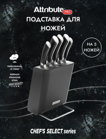 Подставка для ножей Attribute Chef`s select APK015 представляет собой элегантное и функциональное решение для хранения кухонных ножей. Изготовленная из нержавеющей стали и массива гевеи, она обеспечивает надежное размещение до 5 ножей.