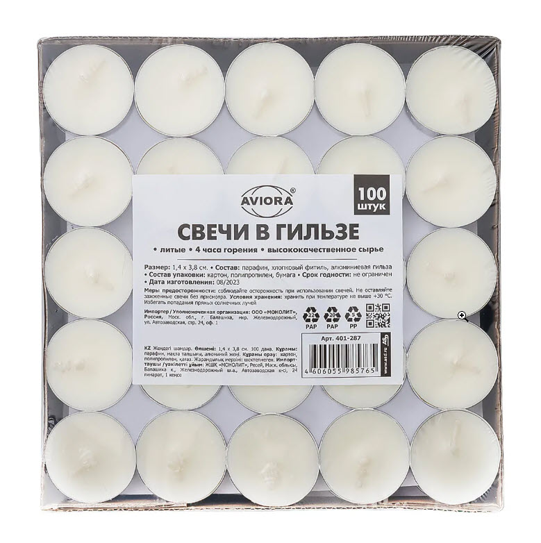 Свечи чайные в гильзе, литые, 100 шт. в картонной подложке