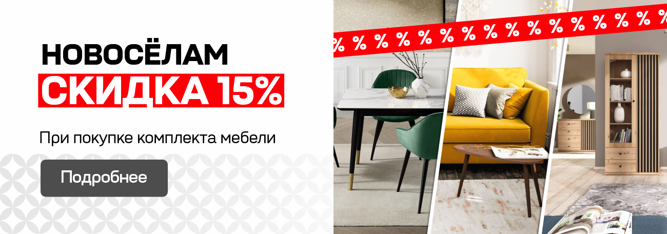 При комплексной покупке товаров из категорий мебели (не менее трёх различных категорий из списка ниже) новосёлы получают скидку 15% на всю мебель в чеке.